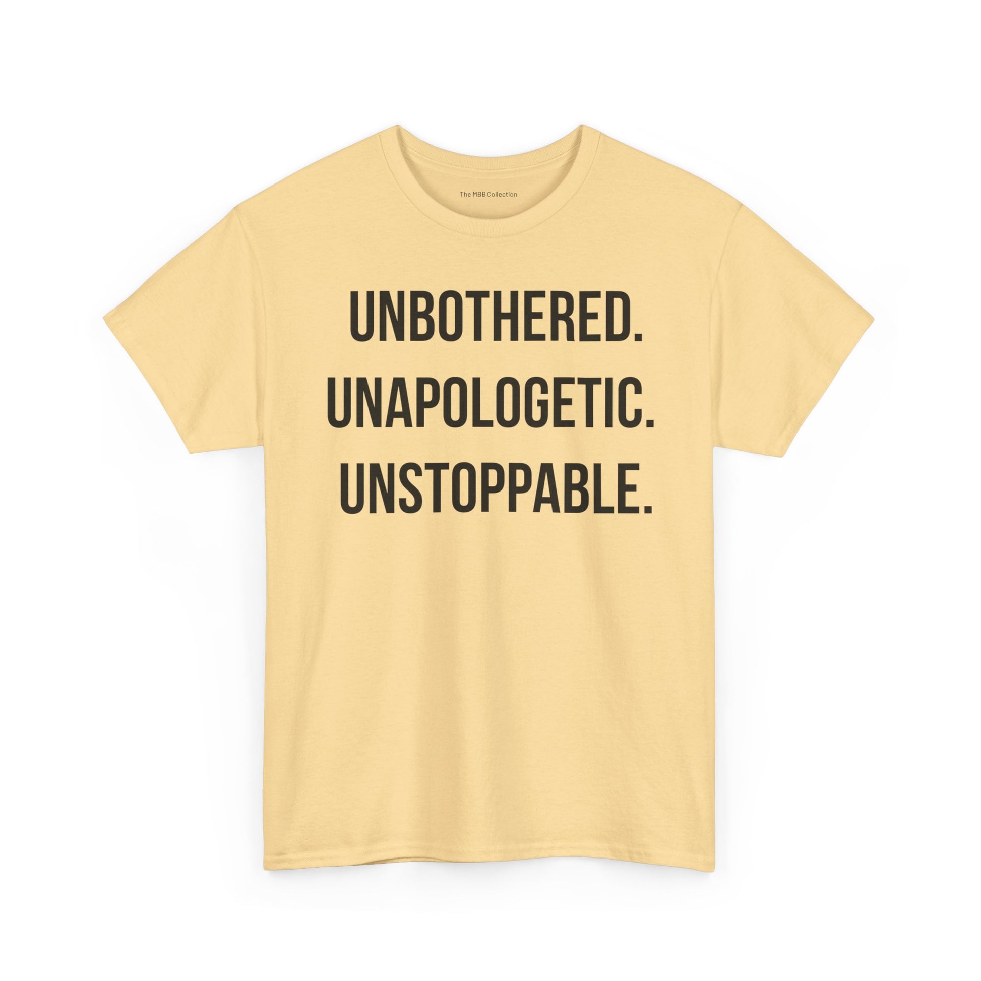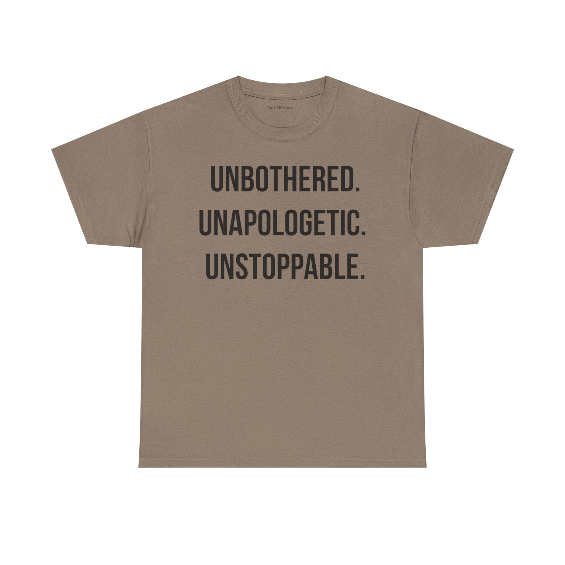Empower yourself with this motivational statement tee that exudes an unbothered, unapologetic, and unstoppable vibe. Perfect for casual, laid-back fashion and empowering self-expression. Suitable for adults, this tee is made from high-quality, sustainable materials for year-round comfort.
